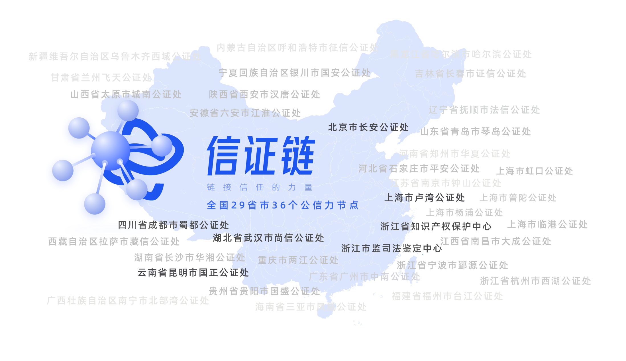 全国性公信联盟区块链平台 “信证链” 基于区块链的可信存证与数据协同技术优势而研发,是首个实现链上链下数据可信协同的全国性运营级区块链平台,旨在实现“一地发起,全国协同,数据可信,服务创新”的目标。 核心优势 具备公信力的权威联盟链 价值互联网可信基础设施 多场景链上链下信任协同 国产自主可控区块链底层 信证链节点 信证链已在全国范围内链接29个省级行政区36家公信力机构,旨在打造可信、安全、高效的分布式数据协作生态设施。通过在全国“筑链成网”,成为可信数字社会的基础设施和可信数字资产流通基础设施。 应用场景